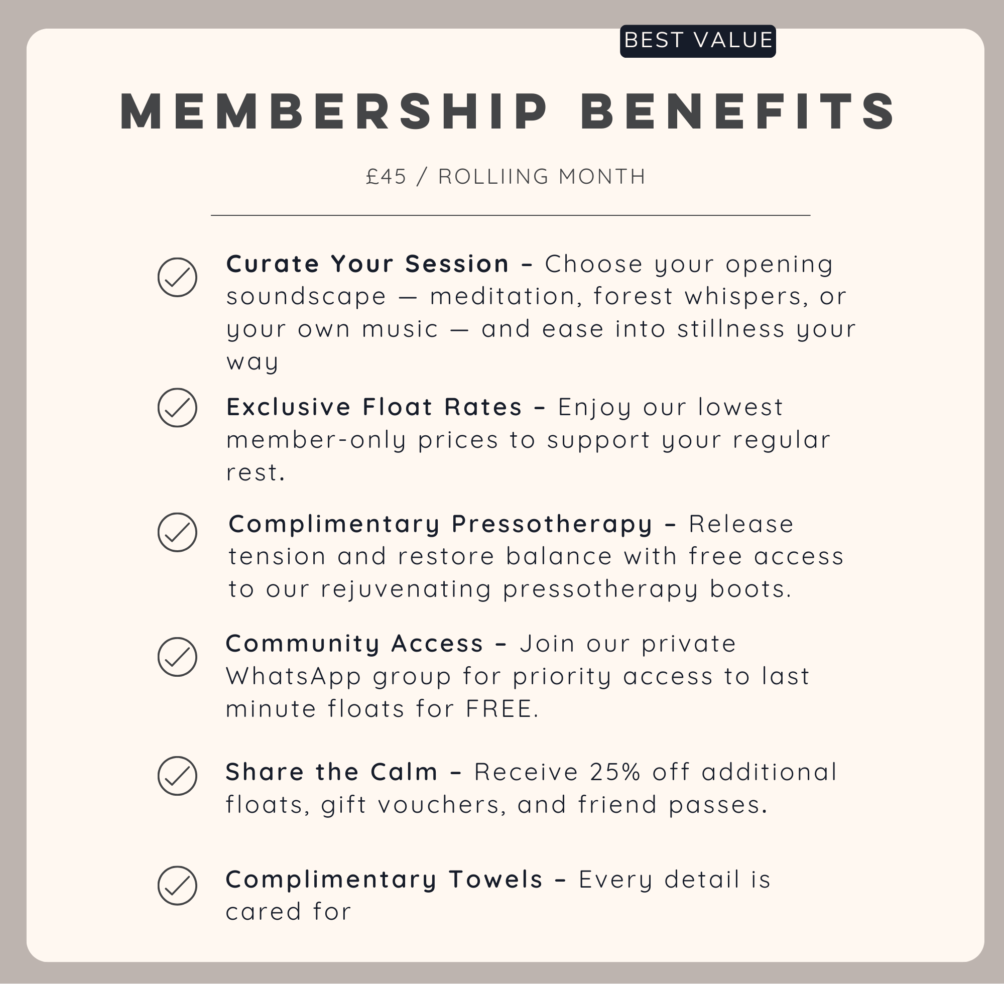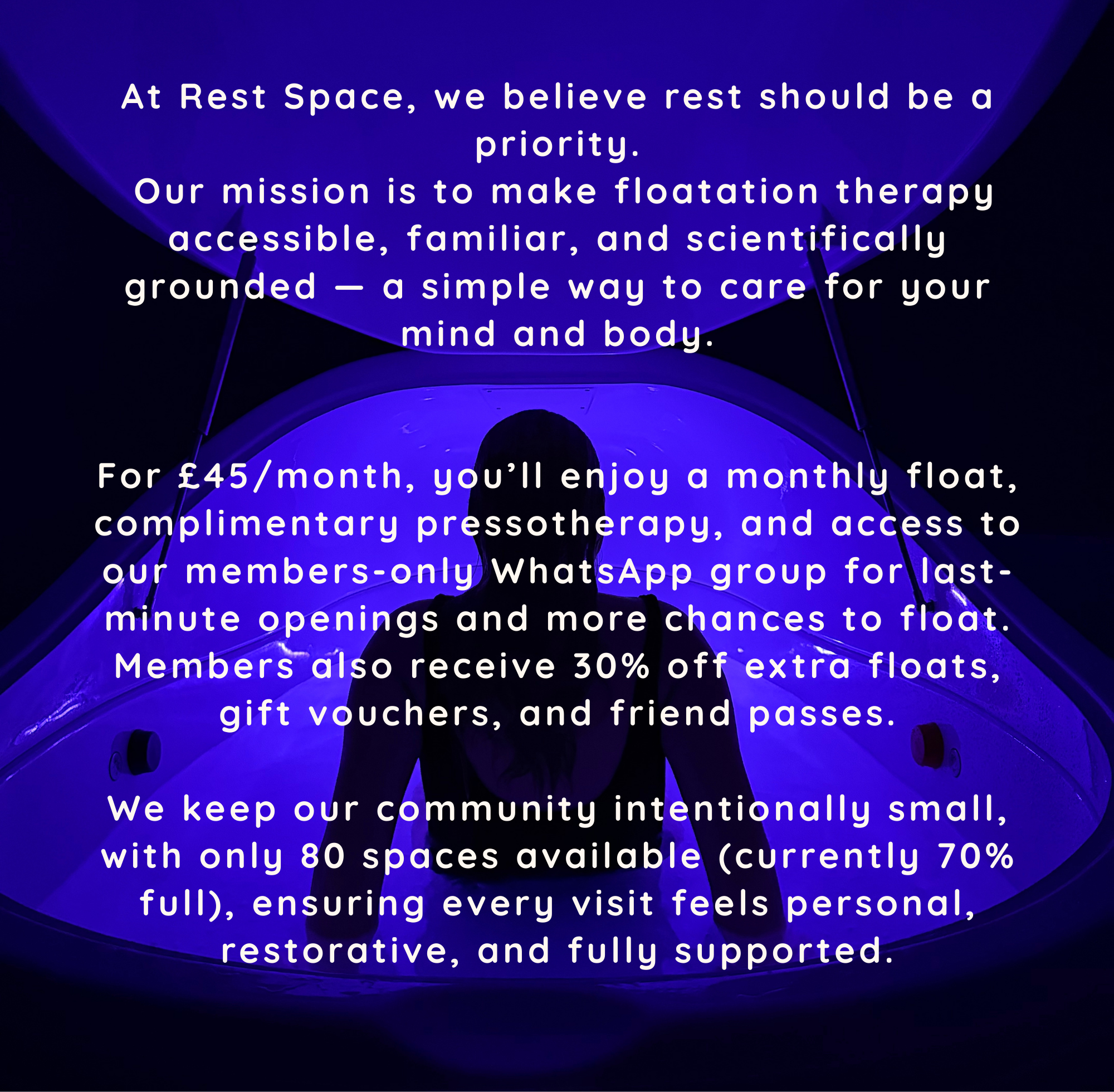 Our members will also have access to an exclusive WhatsApp group which gives you the chance to get last minute floats, learn about floatation therapy and be the first to hear about all of the exciting events we have!
