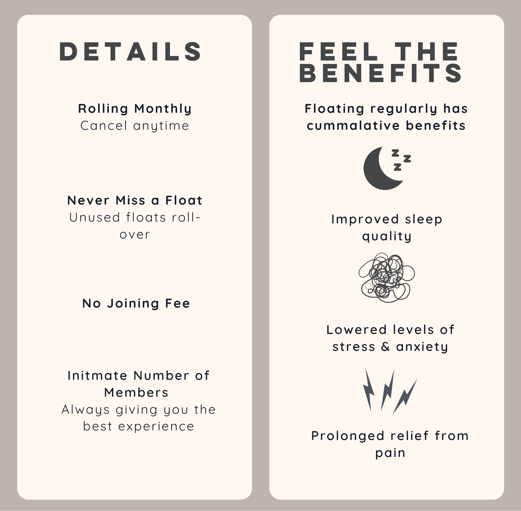Our packages can be used like floating credits, the more you buy the higher the discount we can offer. They're a great alternative to a monthly membership ritual, allowing you to float when you want and most importantly, when you need. Perfect to use at the end of an especially busy work week, after a poor nights sleep, when experiencing writers block or perhaps preparing for a sporting competition.